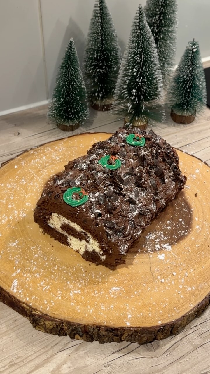 Christmas Yule Log ????❄️????Ingredients:3 eggs85g caster sugar 85g plain flour Cocoa powder 1/2 teaspoon baking powder 300g Double cream 300g Icing powder300g ButterMethod:Preheat oven to 180 degrees. Whisk eggs and sugar together until pale and foamy. Add in flour, 2 tbl spoons of cocoa powder and 1/2 tsp of baking powder and whisk. Place in a shallow baking tray lined and pop in the oven to bake for 10 minutes. Once done, roll your log while it’s hot into shape. Leave aside to cool. While your log cools, whisk your double cream until it’s fluffy. Unroll your log once cool and coat in whipped cream before rolling back up into shape. Create the chocolate icing with equal parts icing sugar to butter. Once beaten add in 3 teaspoons of cocoa powder and whisk. Coat your log in chocolate icing and then use a fork to create wavey lines. I added some dark chocolate flakes and icing wreaths I sourced from @waitrose and then lightly dusted with icing sugar to serve. #YuleLog #ChristmasDessert #FestiveBakes #HolidayTreats #ChocolateYuleLog #BûcheDeNoël #HolidayBaking #ChristmasTraditions #DessertGoals #WinterIndulgence