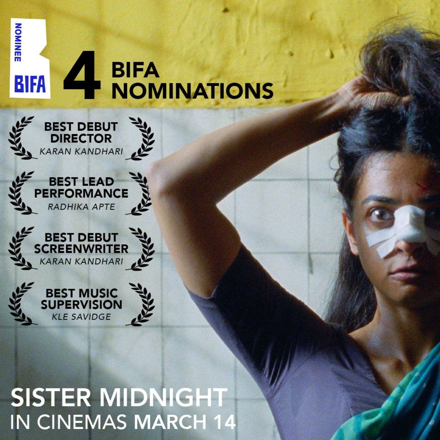 Calling Sister Midnight... ???? ???? The @bifa_film votes are in and SISTER MIDNIGHT has an amazing 4 nominations! ????Huge congratulations to writer-director Karan Kandhari (@deathpunkbaby), lead Radhika Apte (@radhikaofficial), music supervisor Kle Savidge (@klesavidge_musicsupe), and the entire filmmaking team! ????In cinemas March 14 ???? ????️#sistermidnight #bifa2024