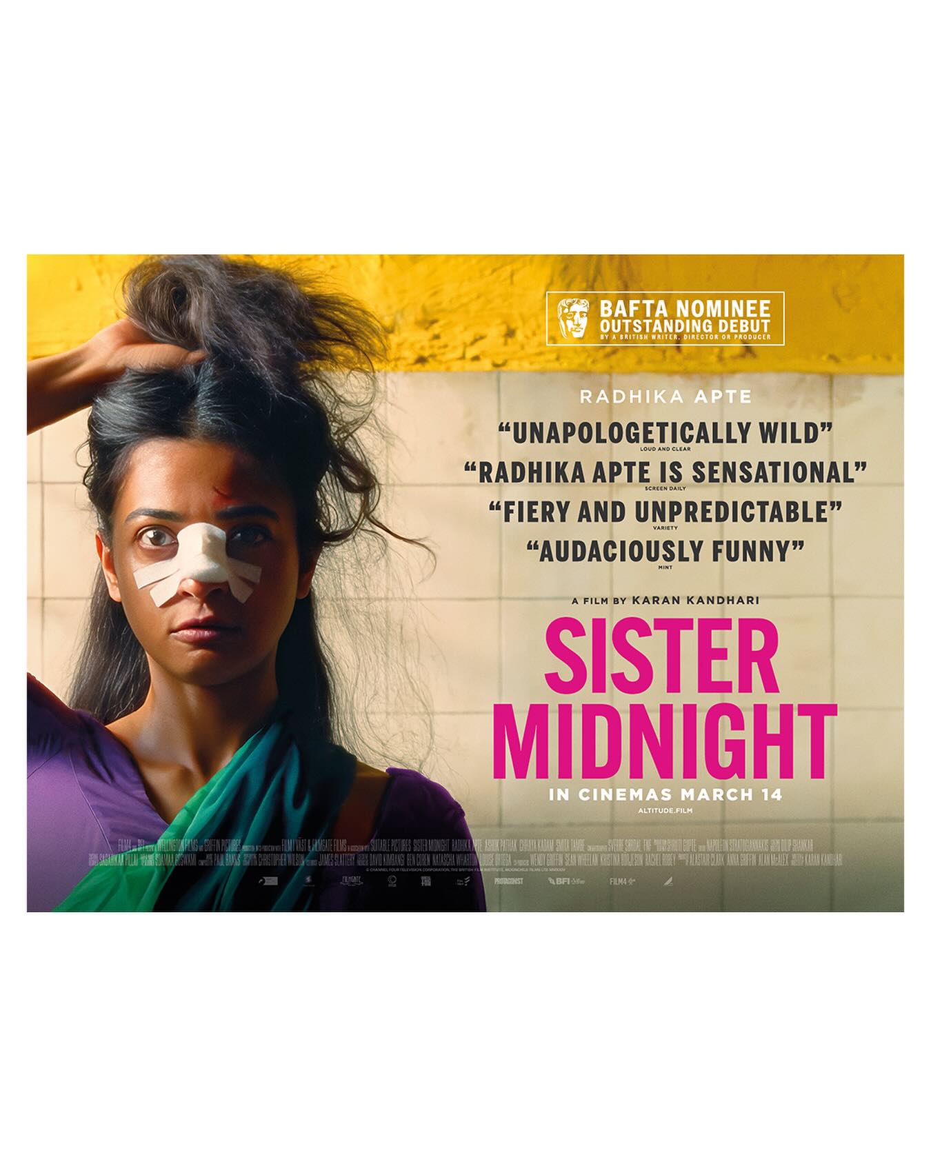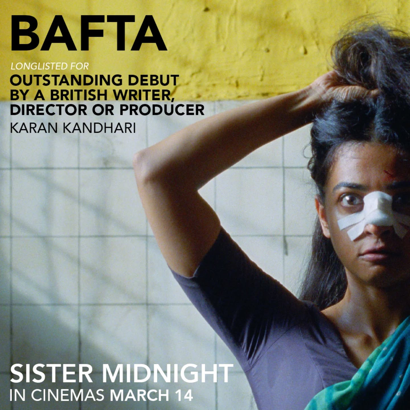 SISTER MIDNIGHT has been longlisted by @bafta for Outstanding Debut by a British Writer, Director or Producer! ????????Huge congratulations to debut writer-director Karan Kandhari (@deathpunkbaby) and the whole filmmaking team!In Cinemas March 14 ???? ????️#sistermidnight #bafta #eebaftas