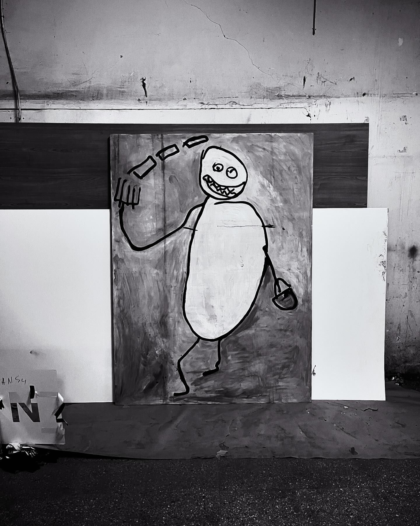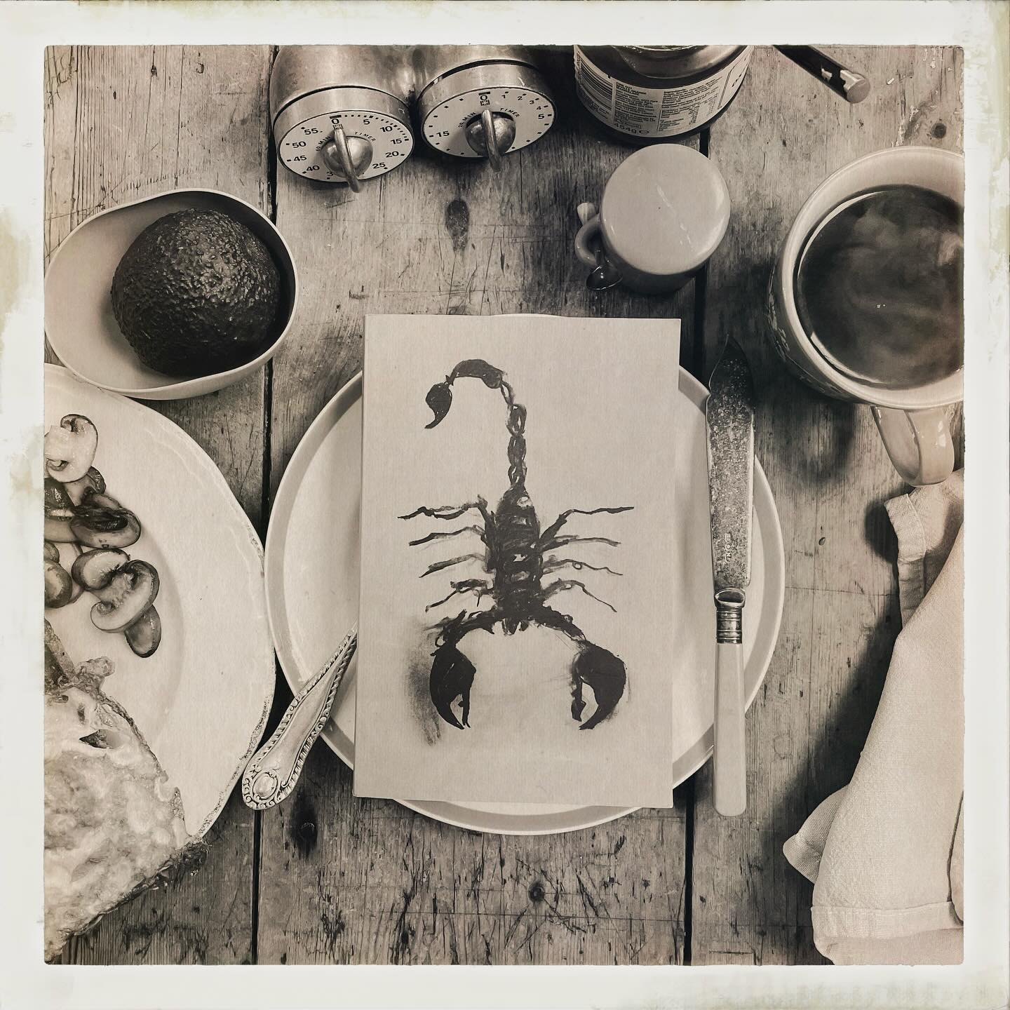 Giant Lithuanian freehand of a man with two left feet and pitchforks for hands juggling fish fingers into a clutch bag. I’m into it.