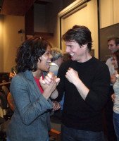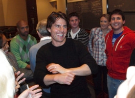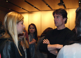 Когда занятие подошло к концу, Том направился было к первым рядам, чтобы попрощаться со студентами и преподавателем, но тут в коридоре раздался вопль: “ТОМ КРУЗ!!!!” - и в зал влетела толпа, которая не присутствовала на лекции. Круз не растерялся и продолжил улыбаться и махать ручкой всем желающим. Вопросы так и сыпались. Тома спросили, есть ли роль, от которой он отказался и пожалел. “Нет”, - был быстрый и краткий ответ. Также молодежь интересовалась тем, как трое детей Круза взаимодействуют с папарацци. Круз объяснил, что учит детей ничего не бояться, поэтому папарацци они игнорируют. Сури иногда прикалывается в таком стиле - внезапно взмахивает рукой и спрашивает: “Почему меня преследует этот человек? Это частное пространство!” Неслабо для трехлетней девочки!