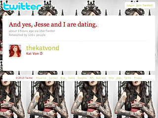 Не успел представитель Джесси Джеймса, бывшего мужа Сандры Буллок, опровергнуть слухи о романе своего подопечного с татуированной телезвездой Кэт фон Ди, как последняя взяла и подтвердила их. Барышня написала в своем Твиттере, что таки, да, они с Джесси встречаются.