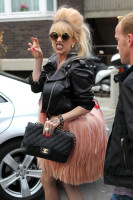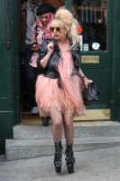 GaGa была одета в розовое платье в стиле «фламинго» и черную кожаную куртку.