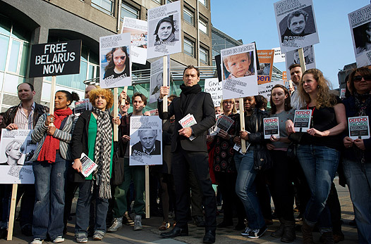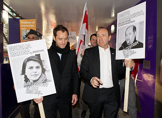 Мировая общественность возмущена волной политических арестов, "накатившей" на Беларусь. Вчера, вооружившись плакатами с портретами оказавшихся в тюрьме журналистов, по улицам Лондона прошлись Джуд Лоу и Кевин Спейси.