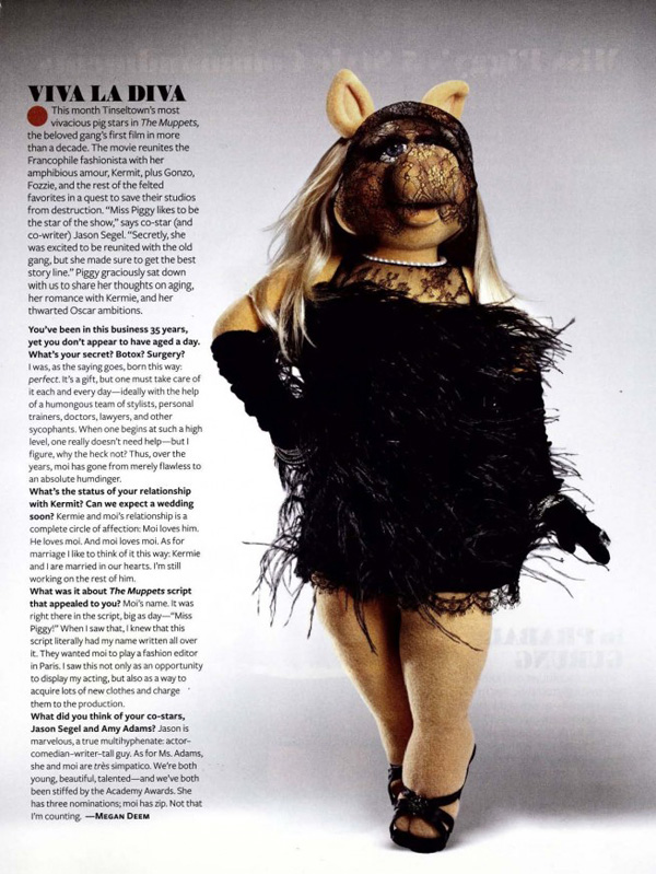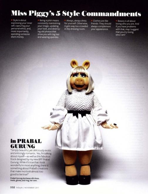 Самая прекрасная девушка всех времен - Мисс Пигги (Miss Piggy) заняла почетное место на страницах ноябрьского InStyle Magazine. Прекрасная свинка украсила собой наряды от известных дизайнеров.