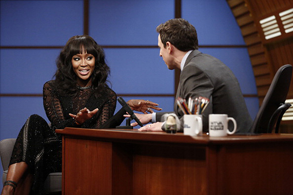Или новая прическа не понравилась Наоми или же по другой причине, но Кэмпбелл побыла с «афро» на одном шоу, через пару часов появилась в телепередаче Сета Майерса уже с нежными локонами.