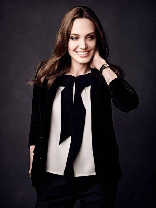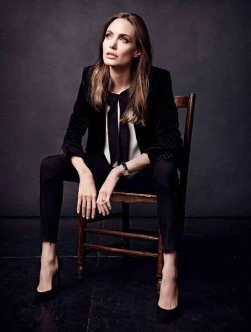 Красавица выбрала для фотосессии свой любимый классический образ. Джоли выглядит элегантно в строгом черном брючном и белоснежной рубашке.