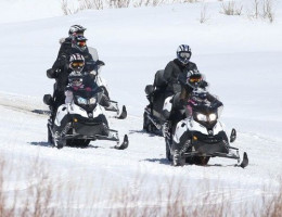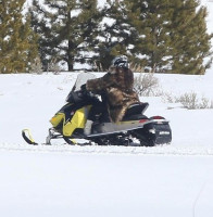 На горнолыжном курорте все дружно катаются на лыжах, гоняют на снегоходе.
