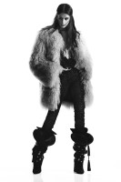 На черно-белых фотографиях красавица в рубашках, вельветовых джинсах, блузах и вещах из кожи и меха.