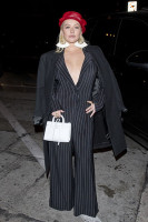 Красавица направлялась в один из голливудских ресторанов. Для ужина Кристина выбрала черный костюм в белую полоску. Пиджак был одет на голое тело, подчеркивая глубокое декольте певицы. Образ в стиле 20-х годов прошлого века добавили нюдовые босоножки, белая сумочка и красный берет. Отличным дополнением стали крупные серьги белого цвета.