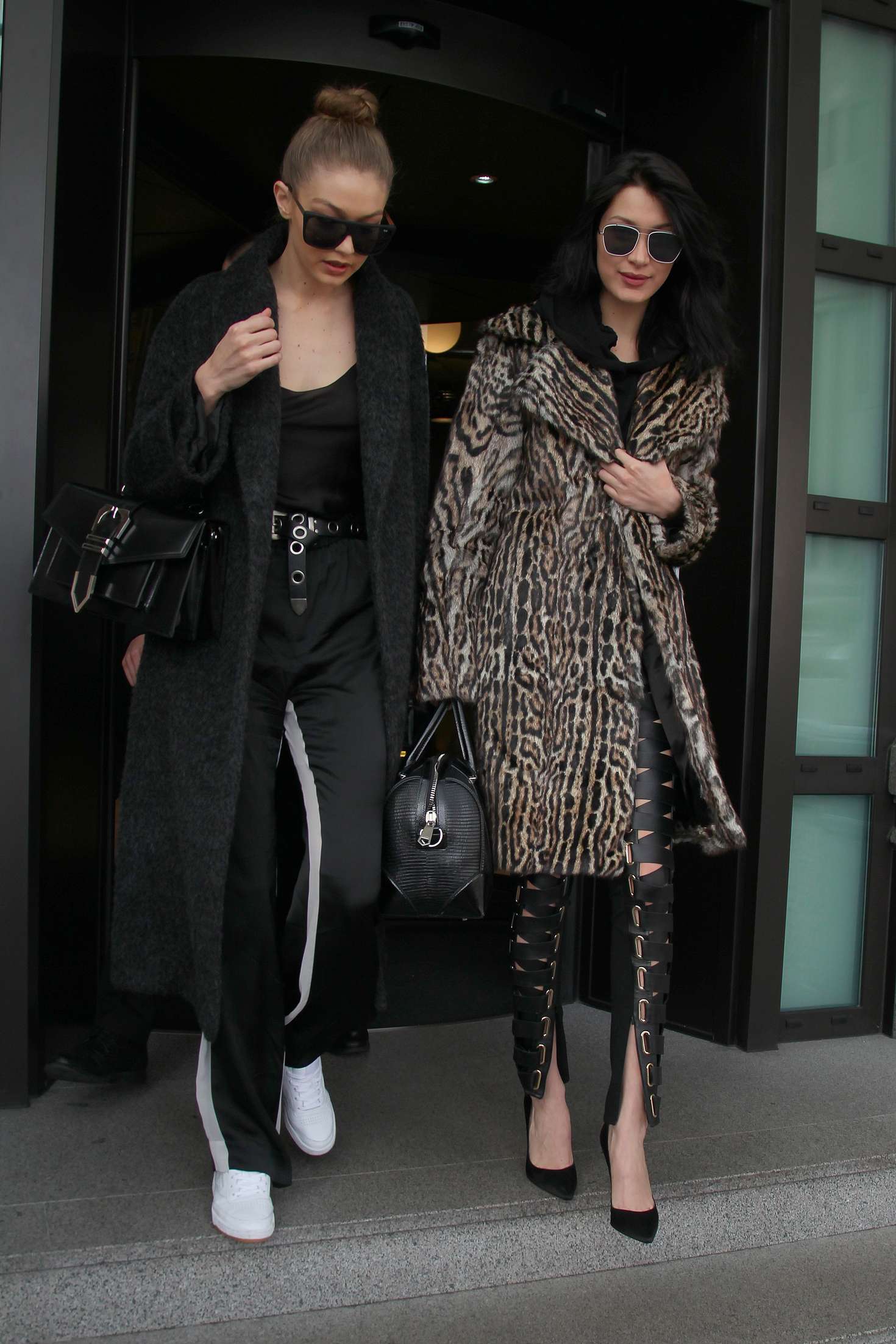 Bella Hadid in Leopard Print Coat Leaving her hotel in Milan